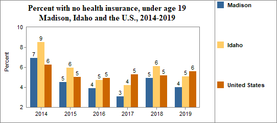 - 4.0 percent of children under the age of 19, or 446 children, had no health insurance coverage compared to 5.1 percent of all children in Idaho;