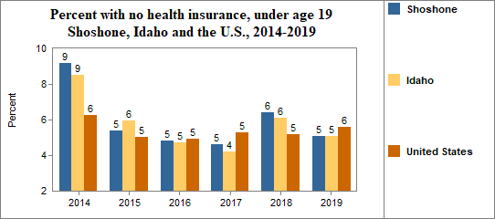 - 5.1 percent of children under the age of 19, or 136 children, had no health insurance coverage compared to 5.1 percent of all children in Idaho;