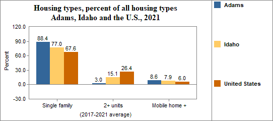 Housing types include single family homes, structures with two housing units (like duplexes), multiple units per structure (three or more units, such as apartment buildings), mobile homes and other housing types.