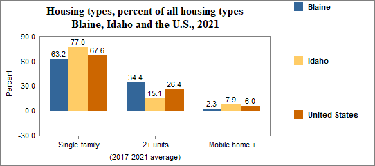 Housing types include single family homes, structures with two housing units (like duplexes), multiple units per structure (three or more units, such as apartment buildings), mobile homes and other housing types.