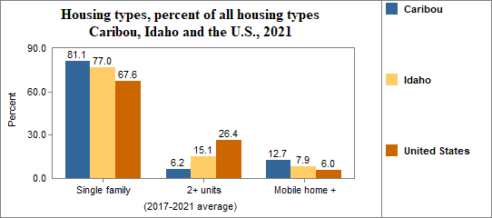 Housing types include single family homes, structures with two housing units (like duplexes), multiple units per structure (three or more units, such as apartment buildings), mobile homes and other housing types.