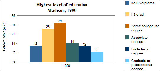 In Madison . . . - 12 percent of the population 25 years and older in 2000 had no high school diploma, compared to 15 percent in Idaho
