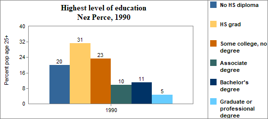 In Nez Perce . . . - 15 percent of the population 25 years and older in 2000 had no high school diploma, compared to 15 percent in Idaho