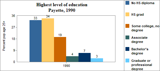 In Payette . . . - 26 percent of the population 25 years and older in 2000 had no high school diploma, compared to 15 percent in Idaho
