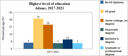 Educational attainment refers to the highest level of school completed. In Adams between 2017-2021 . . .