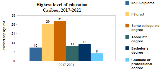 Educational attainment refers to the highest level of school completed. In Caribou between 2017-2021 . . .