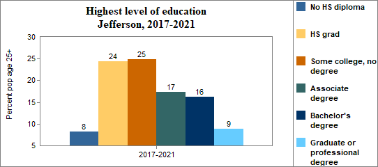 Educational attainment refers to the highest level of school completed. In Jefferson between 2017-2021 . . .
