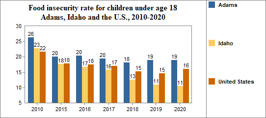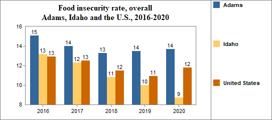 Between 2010 and 2020, the food insecure population in Adams decreased by 32 percent and the number of food insecure children decreased by 32 percent.