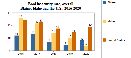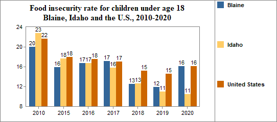 Between 2010 and 2020, the food insecure population in Blaine decreased by 29 percent and the number of food insecure children decreased by 23 percent.
