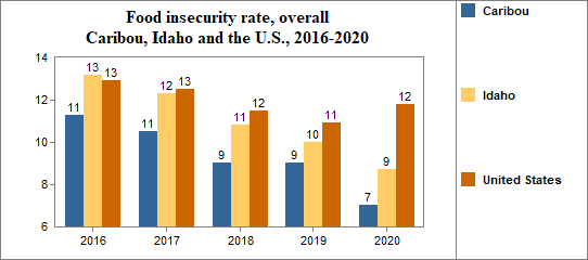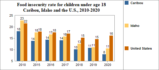 Between 2010 and 2020, the food insecure population in Caribou decreased by 50 percent and the number of food insecure children decreased by 23 percent.