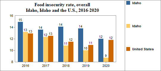 Between 2010 and 2020, the food insecure population in Idaho decreased by 37 percent and the number of food insecure children decreased by 27 percent.