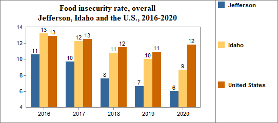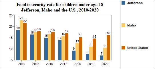 Between 2010 and 2020, the food insecure population in Jefferson decreased by 49 percent and the number of food insecure children decreased by 2 percent.
