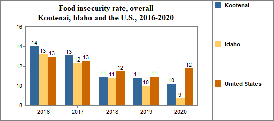 Between 2010 and 2020, the food insecure population in Kootenai decreased by 29 percent and the number of food insecure children decreased by 14 percent.