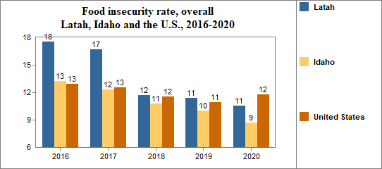 Between 2010 and 2020, the food insecure population in Latah decreased by 35 percent and the number of food insecure children decreased by 10 percent.