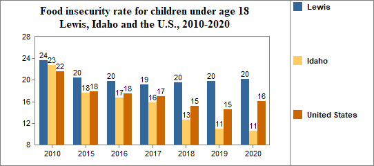 Between 2010 and 2020, the food insecure population in Lewis stayed the same 0 percent and the number of food insecure children decreased by 11 percent.