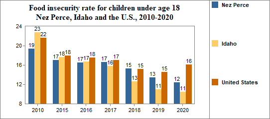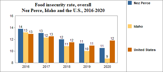 Between 2010 and 2020, the food insecure population in Nez Perce decreased by 25 percent and the number of food insecure children decreased by 10 percent.