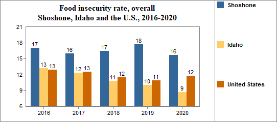 Between 2010 and 2020, the food insecure population in Shoshone decreased by 28 percent and the number of food insecure children decreased by 21 percent.