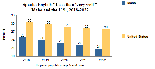 The ability of Hispanics to speak English "Very well" versus "Less than 'very well'" differs by whether the population is native-born or foreign-born. The American Community Survey categorizes the survey respondent's ability to speak English, specifically the respondents who reported speaking a language other than English, as speaking English "Very well," "Well," "Not well," or "Not at all." Those who answer "Well," "Not well," or "Not at all" can be grouped together and termed "Less than 'very well.'" Survey respondents are not instructed as to interpretation of these response categories and the response is self-reported.