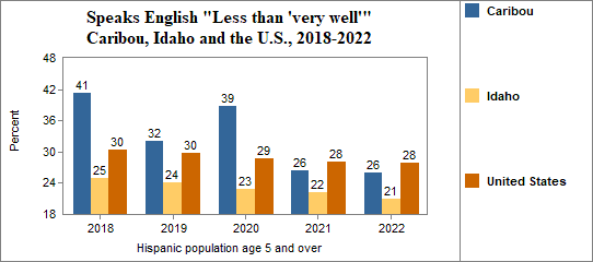 - the foreign-born Hispanic population numbered 306, and 36 percent spoke only English, 21 percent spoke English "Very well" while 43 percent spoke English "Less than 'very well.'"