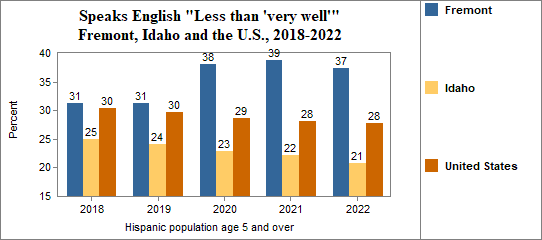 - the foreign-born Hispanic population numbered 672, and 3 percent spoke only English, 23 percent spoke English "Very well" while 75 percent spoke English "Less than 'very well.'"