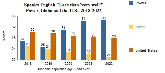 - the foreign-born Hispanic population numbered 1,087, and 12 percent spoke only English, 16 percent spoke English "Very well" while 72 percent spoke English "Less than 'very well.'"