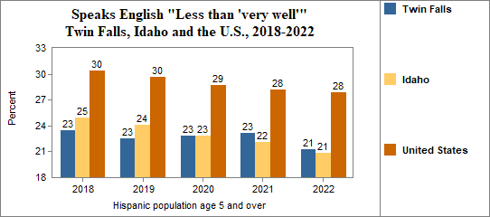 - the foreign-born Hispanic population numbered 4,642, and 7 percent spoke only English, 47 percent spoke English "Very well" while 45 percent spoke English "Less than 'very well.'"