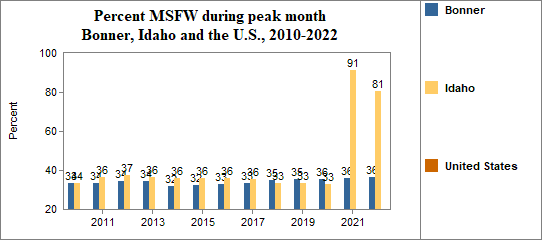 In this indicator we report on the average number of agricultural workers throughout the year and the number and month of peak employment for migrant and seasonal farmworkers (MSFW). The number of MSFW changes month to month as workers move for seasonal employment.