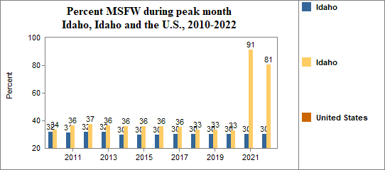 In this indicator we report on the average number of agricultural workers throughout the year and the number and month of peak employment for migrant and seasonal farmworkers (MSFW). The number of MSFW changes month to month as workers move for seasonal employment.