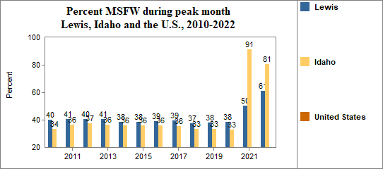 In this indicator we report on the average number of agricultural workers throughout the year and the number and month of peak employment for migrant and seasonal farmworkers (MSFW). The number of MSFW changes month to month as workers move for seasonal employment.