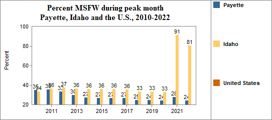 In this indicator we report on the average number of agricultural workers throughout the year and the number and month of peak employment for migrant and seasonal farmworkers (MSFW). The number of MSFW changes month to month as workers move for seasonal employment.
