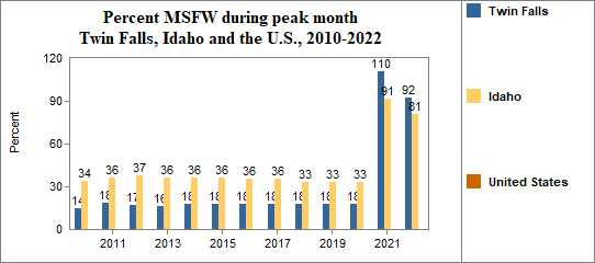 In this indicator we report on the average number of agricultural workers throughout the year and the number and month of peak employment for migrant and seasonal farmworkers (MSFW). The number of MSFW changes month to month as workers move for seasonal employment.