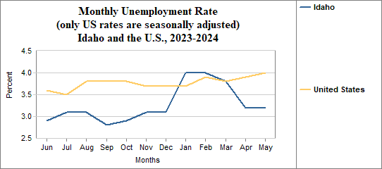 Idaho's monthly unemployment rate was 3.2 percent in May, 2024. This compares to 4.0 percent in the U.S. as a whole.