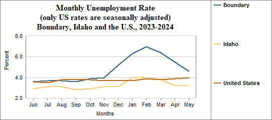 Boundary's monthly unemployment rate was 4.6 percent in May, 2024. This compares to 3.2 percent in Idaho as a whole.