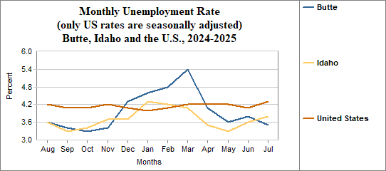 Butte's monthly unemployment rate was 3.5 percent in July, 2025. This compares to 3.8 percent in Idaho as a whole.