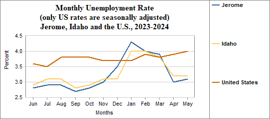 Jerome's monthly unemployment rate was 3.1 percent in May, 2024. This compares to 3.2 percent in Idaho as a whole.