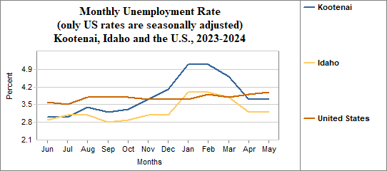 Kootenai's monthly unemployment rate was 3.7 percent in May, 2024. This compares to 3.2 percent in Idaho as a whole.