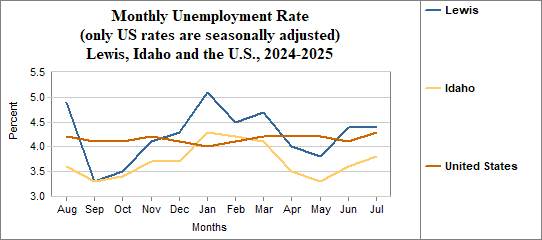 Lewis's monthly unemployment rate was 4.4 percent in July, 2025. This compares to 3.8 percent in Idaho as a whole.