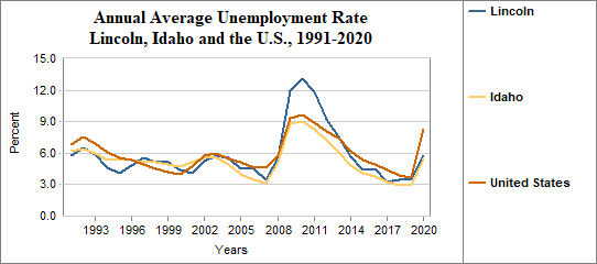 Lincoln's monthly unemployment rate was 3.3 percent in July, 2025. This compares to 3.8 percent in Idaho as a whole.