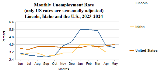 Lincoln's monthly unemployment rate was 3.7 percent in May, 2024. This compares to 3.2 percent in Idaho as a whole.