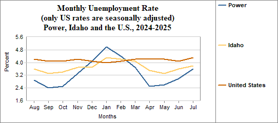 Power's monthly unemployment rate was 3.6 percent in July, 2025. This compares to 3.8 percent in Idaho as a whole.