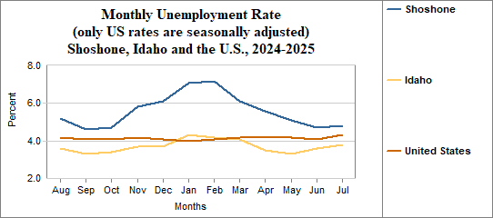 Shoshone's monthly unemployment rate was 4.8 percent in July, 2025. This compares to 3.8 percent in Idaho as a whole.