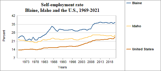 The self-employment rate is the percent of all employed people who have their own businesses (“proprietors”) as opposed to working for someone else in return for wages or salary.