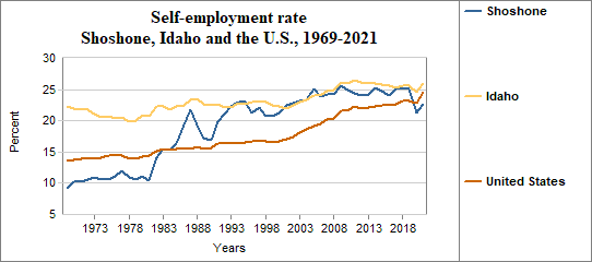 The self-employment rate is the percent of all employed people who have their own businesses (“proprietors”) as opposed to working for someone else in return for wages or salary.