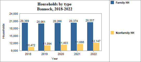 - Family households made up 62.9 percent of the total in 2018-2022, compared to 68.4 percent in Idaho.