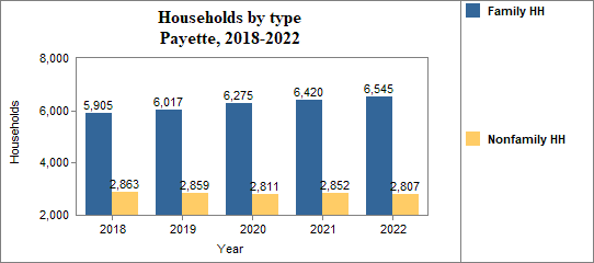 - Family households made up 70.0 percent of the total in 2018-2022, compared to 68.4 percent in Idaho.