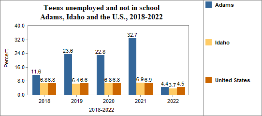 - Teens who were not working, looking for work, or in school made up 4.4 percent of all youth age 16-19 in 2018-2022, compared to 3.7 percent in Idaho.