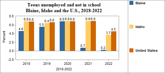 - Teens who were not working, looking for work, or in school made up 0.2 percent of all youth age 16-19 in 2018-2022, compared to 3.7 percent in Idaho.