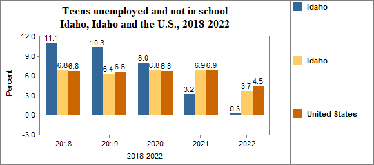 - Teens who were not working, looking for work, or in school made up 0.3 percent of all youth age 16-19 in 2018-2022, compared to 3.7 percent in Idaho.