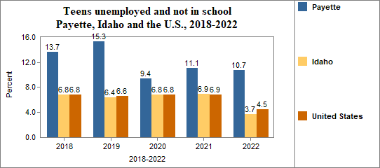 - Teens who were not working, looking for work, or in school made up 10.7 percent of all youth age 16-19 in 2018-2022, compared to 3.7 percent in Idaho.