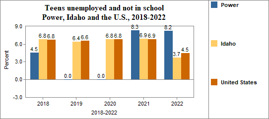 - Teens who were not working, looking for work, or in school made up 8.2 percent of all youth age 16-19 in 2018-2022, compared to 3.7 percent in Idaho.